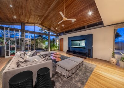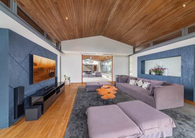 Media Room Sofa seating for 4 persons with 4 ottoman, 2 stool and center table Smart TV Sound bar and Sound Speakers Bookcase 2 Ceiling Fan Airconditioning GALLERY